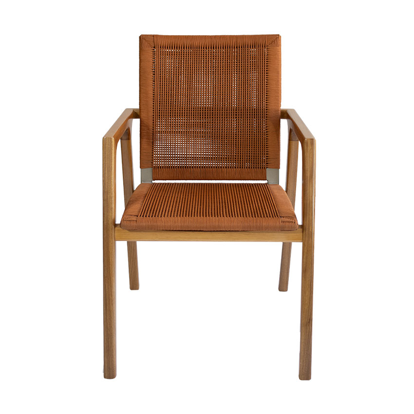 Cadeira fabricada em Estrutura em madeira cumaru, estrutura do assento em alumínio com pintura eletrostática, assento e encosto em corda náutica.